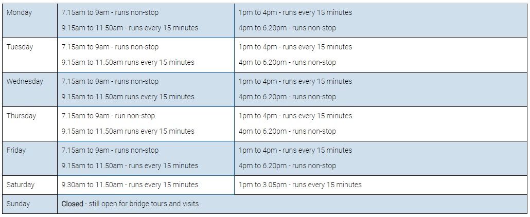 It’s normally possible to cross the Tees via the Transporter Bridge between the hours of 07:15 and 18:20. Depending on the time of day, the service generally runs constantly or every 15 minutes.